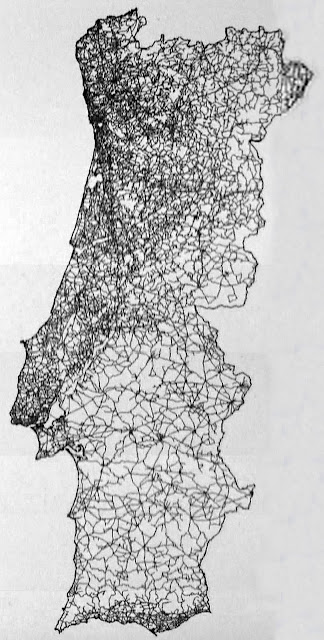 (clique para ampliar)Este impressionante mapa de Portugal Continental está preenchido apenas com uma coisa: estradas. Não todas as estradas. São apenas as estradas pavimentadas. Não tem mais nada. Só estradas pavimentadas. Das auto-estradas às estradas municipais, todas as que estão “alcatroadas” (digamos assim para facilitar) estão lá. Aquelas manchas negras são, pois, "concentrados de estradas alcatroadas".